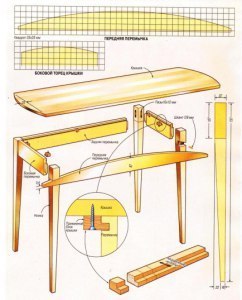 Крышка: делаем из четырех кленовых досок толщиной 90 мм. Нужно тщательно отфуговать ребра досок, затем склеить и зажать струбцинами. После высыхания, отпилите крышку нужно ширины. Выпилите, используя ленточную пилу, выпуклые торцы и разместите их на концах крышки.